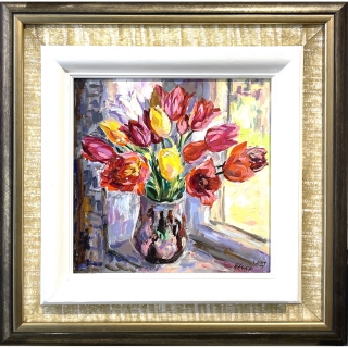 Летните букети ни описват друга красота- тази на ирисите, слънчогледите, маковете и полетата с тях, на Полските цветя и техния аромат на слънце! Ами розите!? О,смайващи ни със силния си и много натежал цвят, многолистни и по-семпли пръскат аромата си и от платната! Понякога разказани и по-пастелно, друг път с повече акцент- релефно.