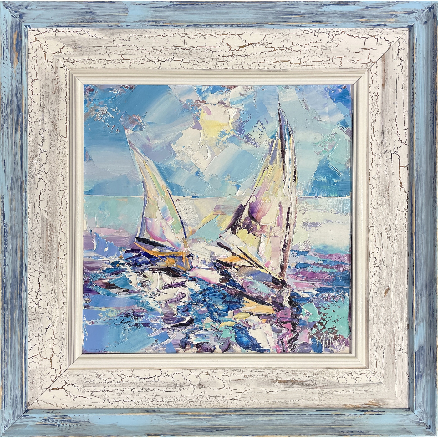 Две Платноходки в Синьо. Въпреки почти абстрактното представяне на морския пейзаж, картината е заредена с много цветови реализъм, особен контраст и приятна хармония. Точен и синтезиран израз на лятното слънце и динамиката в цветовете. Картина с много емоционален заряд.