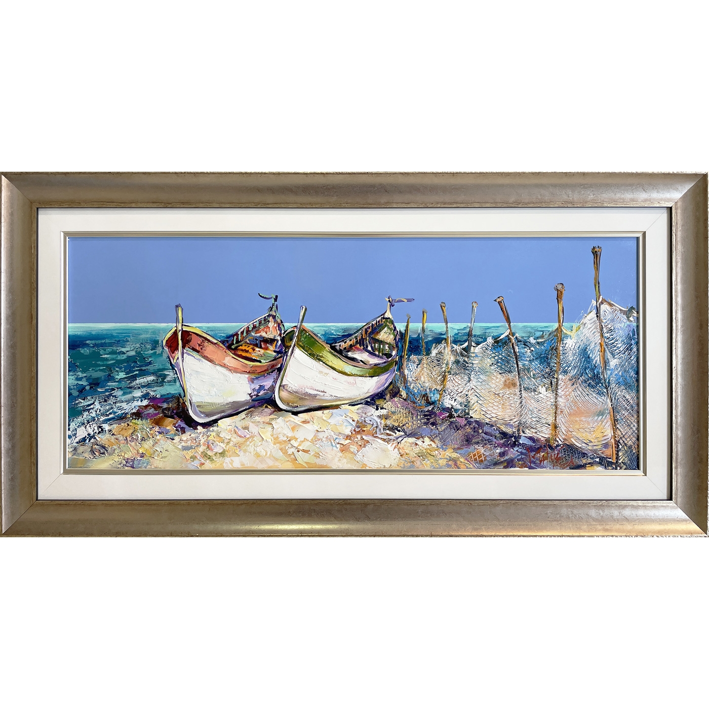 Morning by the sea. Warm light opens a view of the blue sea and two boats that will take the road to the horizon at any moment. The nuanced beach contrasts with the blue of the morning.
