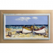 Picture of the summer sea. Extremely interesting workmanship. A light morning light opens the horizon to which the two boats will head in a moment. In anticipation of a rich catch of adventure and a lot of emotions during the upcoming long day. Soft and cold tones in wonderful combinations with ocher and light blue.