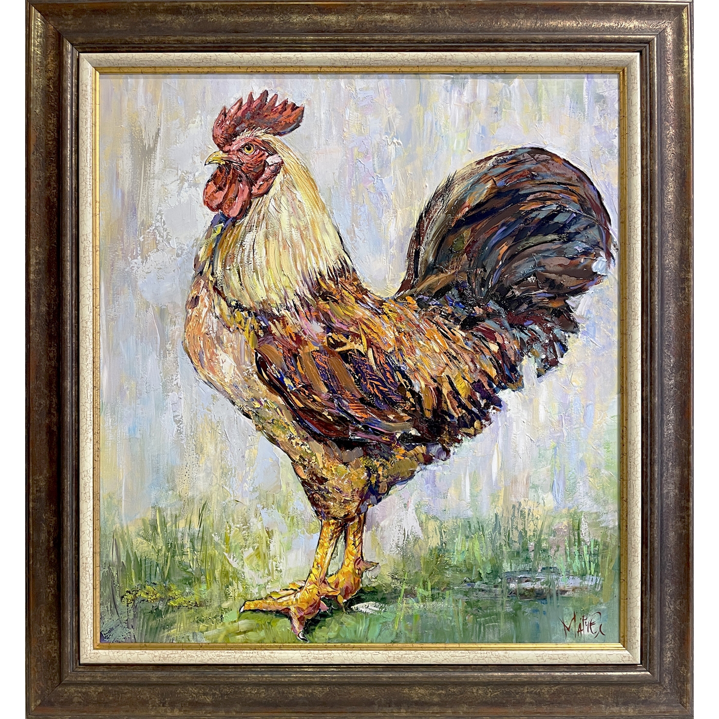 Почти портретно нарисуван петел.Уникален с оперението си и нахалния поглед, няма как да не предизвика закачка и добро настроение!