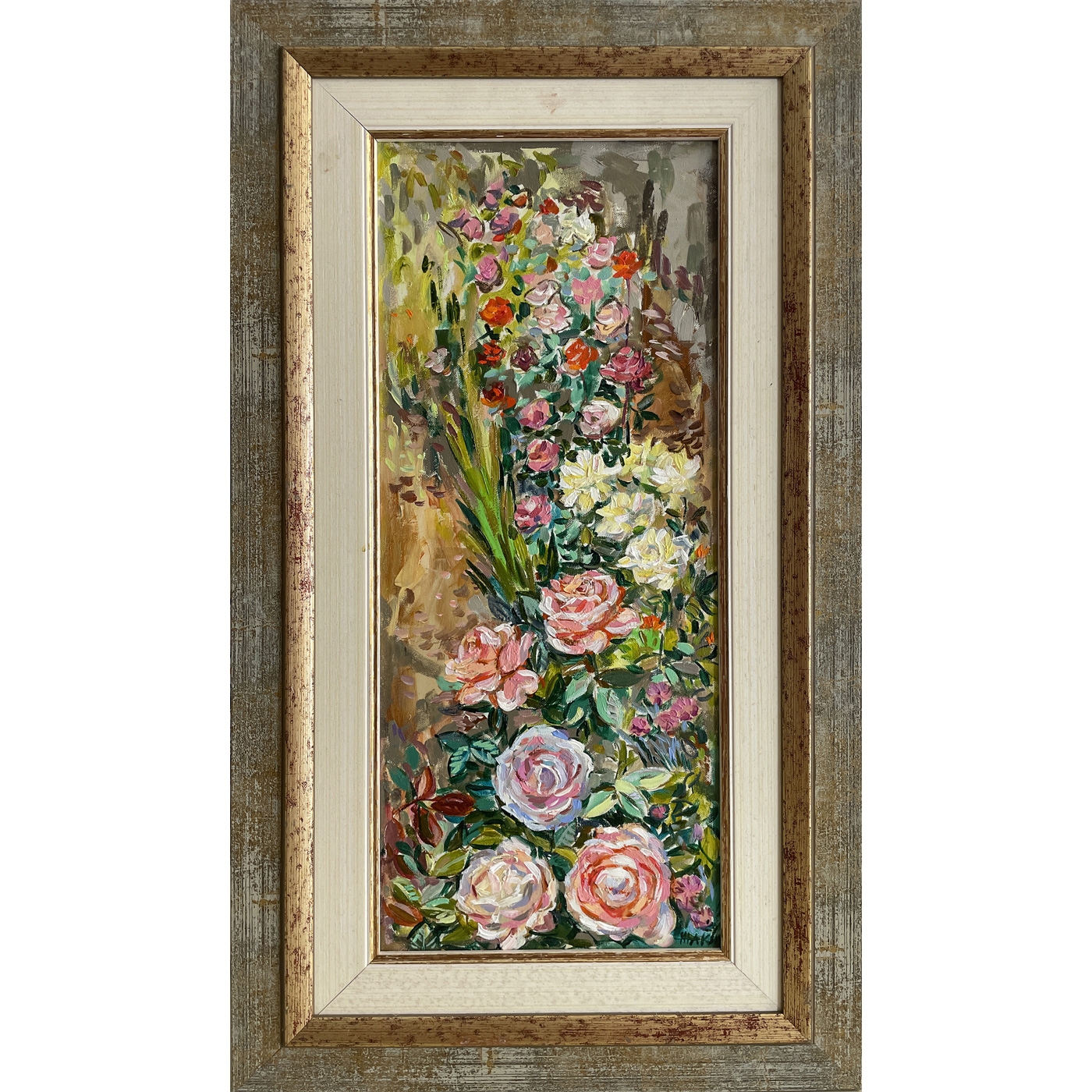 Детайл от "цветен букет"-цветя в градината. Нарисувани в много приятна, мека и пастелна гама добре аранжираните и композирани цветя разкриват величието на природата и неповторимостта на Твореца.