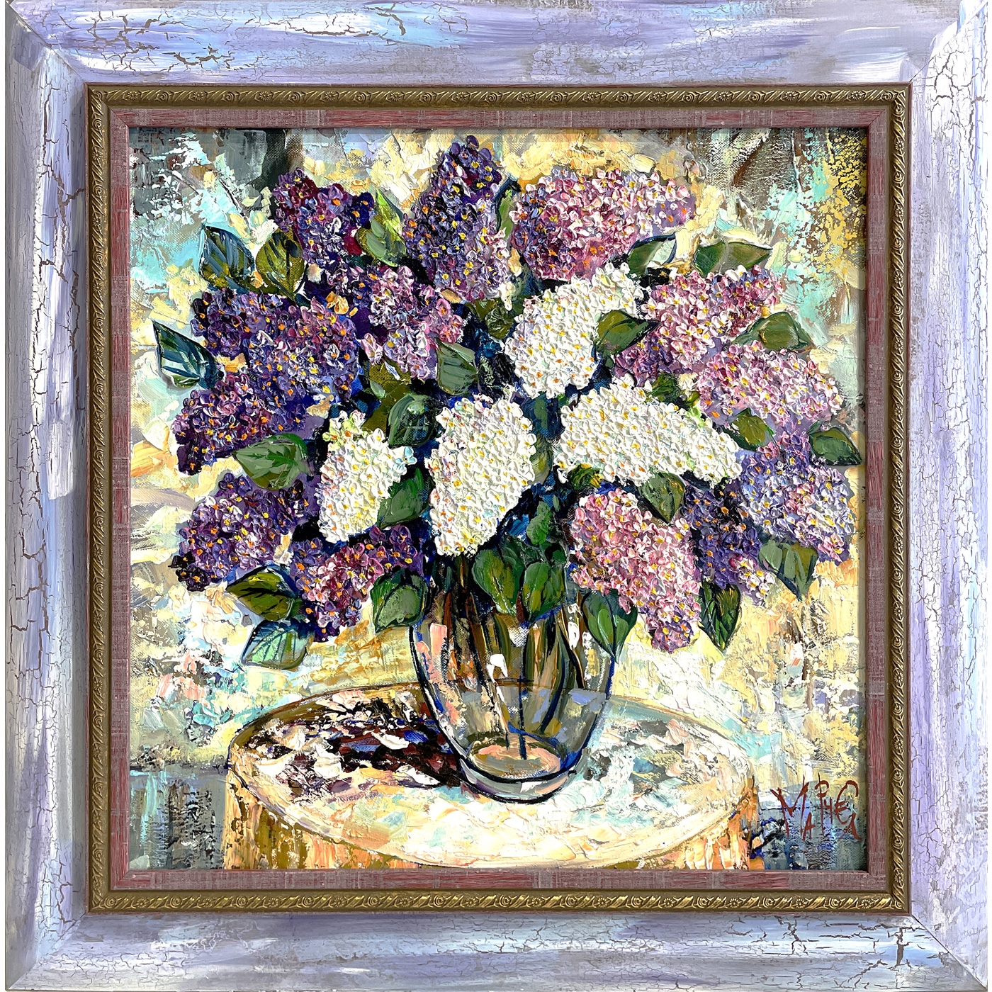 Малко люляково букетче в стъклена ваза. Изключителен детайл въпреки малкия формат,много приятна гама и настроение от пролетта.
