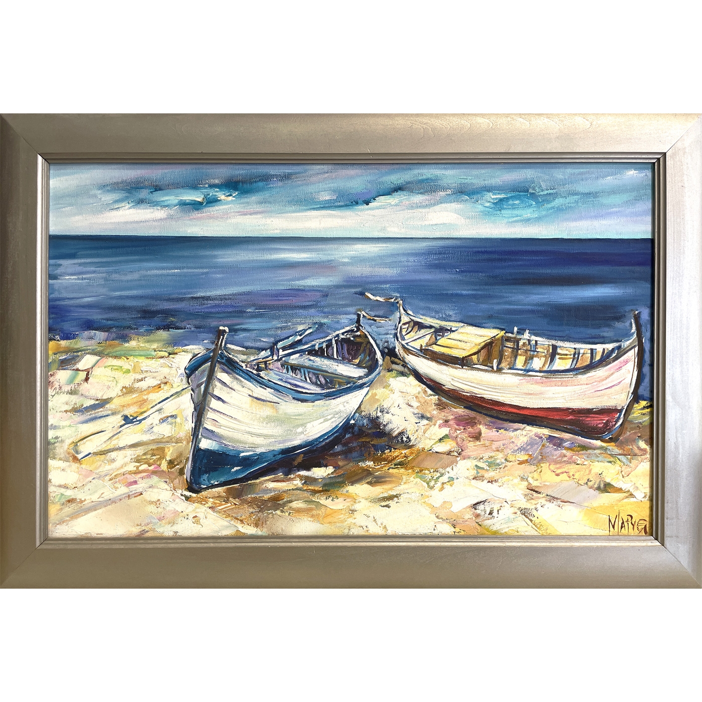 Две лодки на брега на морето. Разказани в топлината на морските цветове.