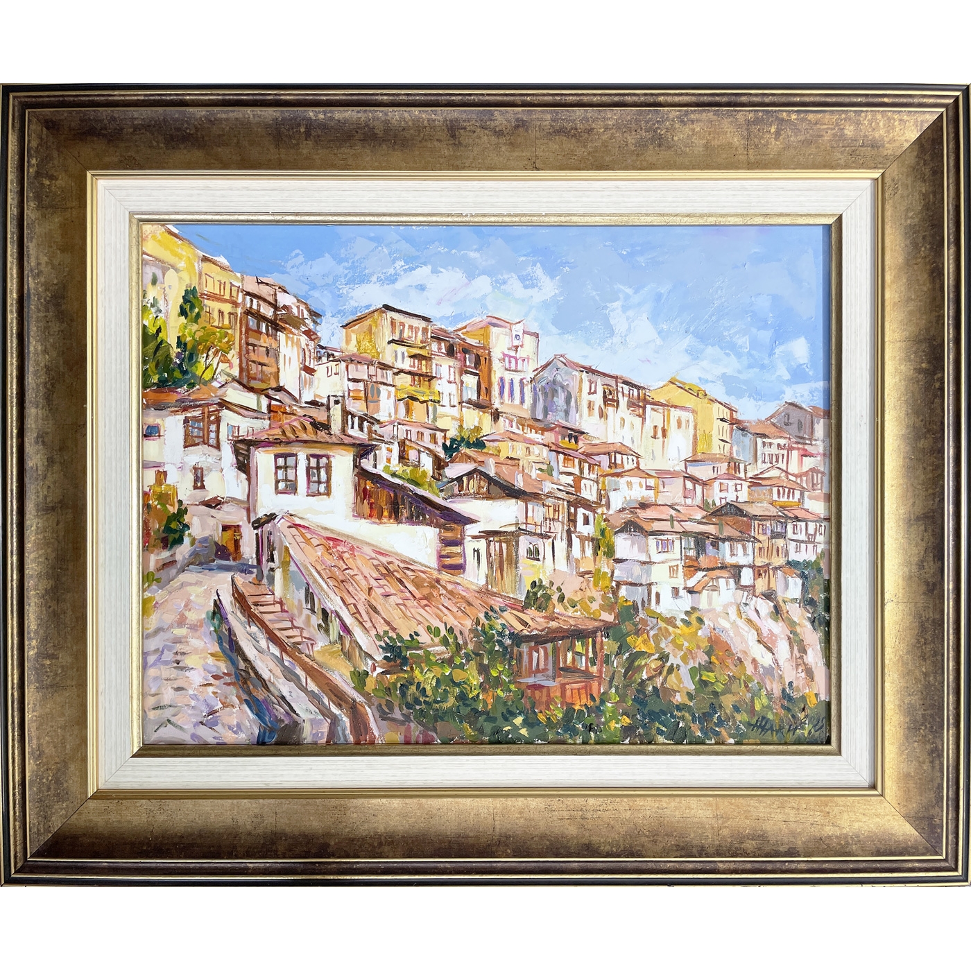 Прекрасен летен пейзаж от Велико Търново. Най-привлекателната и неповторима панорамна гледка от стария град - накацали върху скалите къщички в оригинален дървен обков.