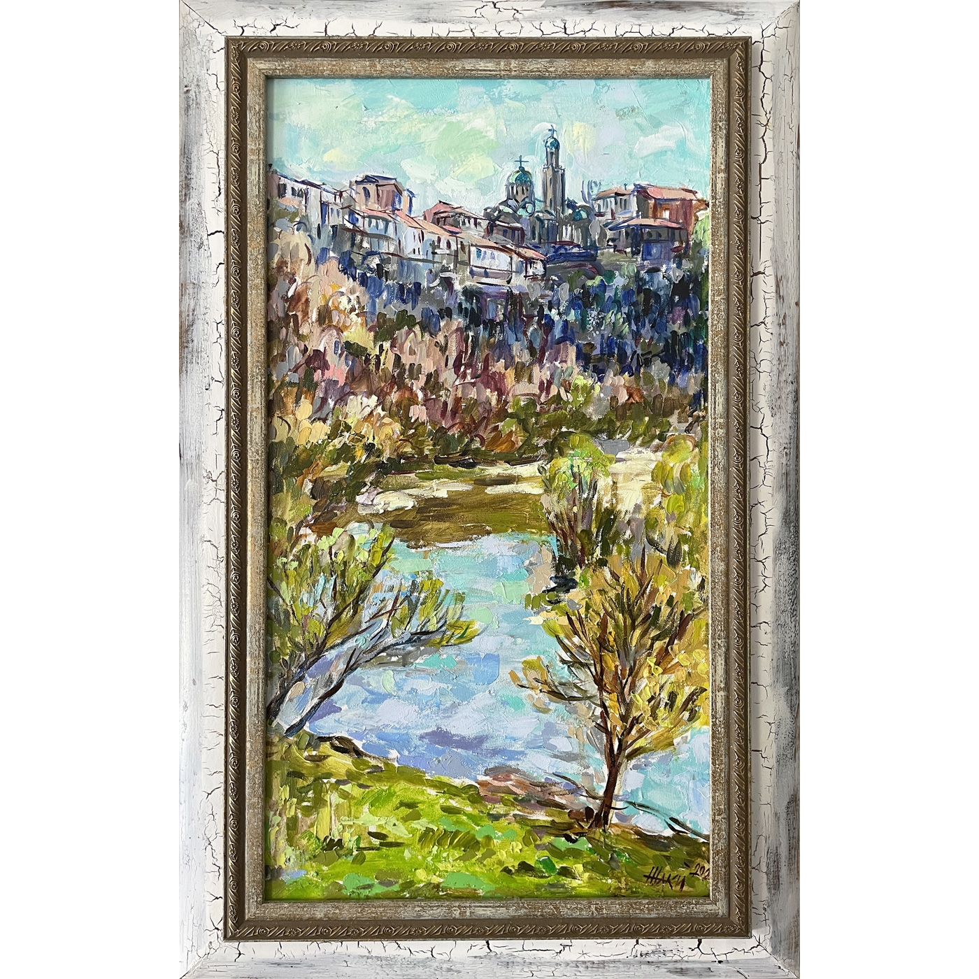 Пролетна панорама от Велико Търново отразяваща старата част на града погледната откъм реката.Топла и контрастна гама-типична за пролетното слънце.