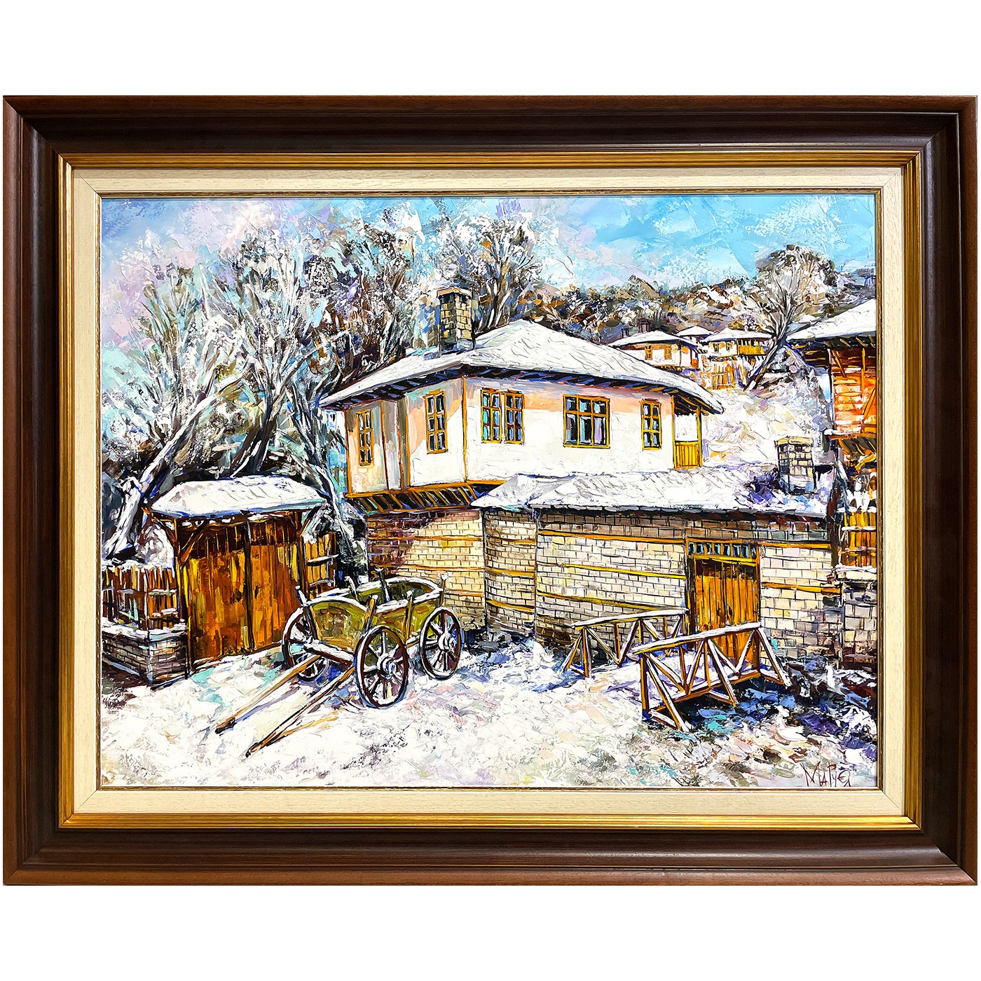 Winter picture of the Bulgarian village. A diagonal composition, open in its nature, is vividly emphasized by the stream and the bridge. The landscape brings a certain dynamism, reinforcing the feeling of the season. The warmth of the houses in the village are in contrast to the purely natural detail and contrast with their warmth and coziness.