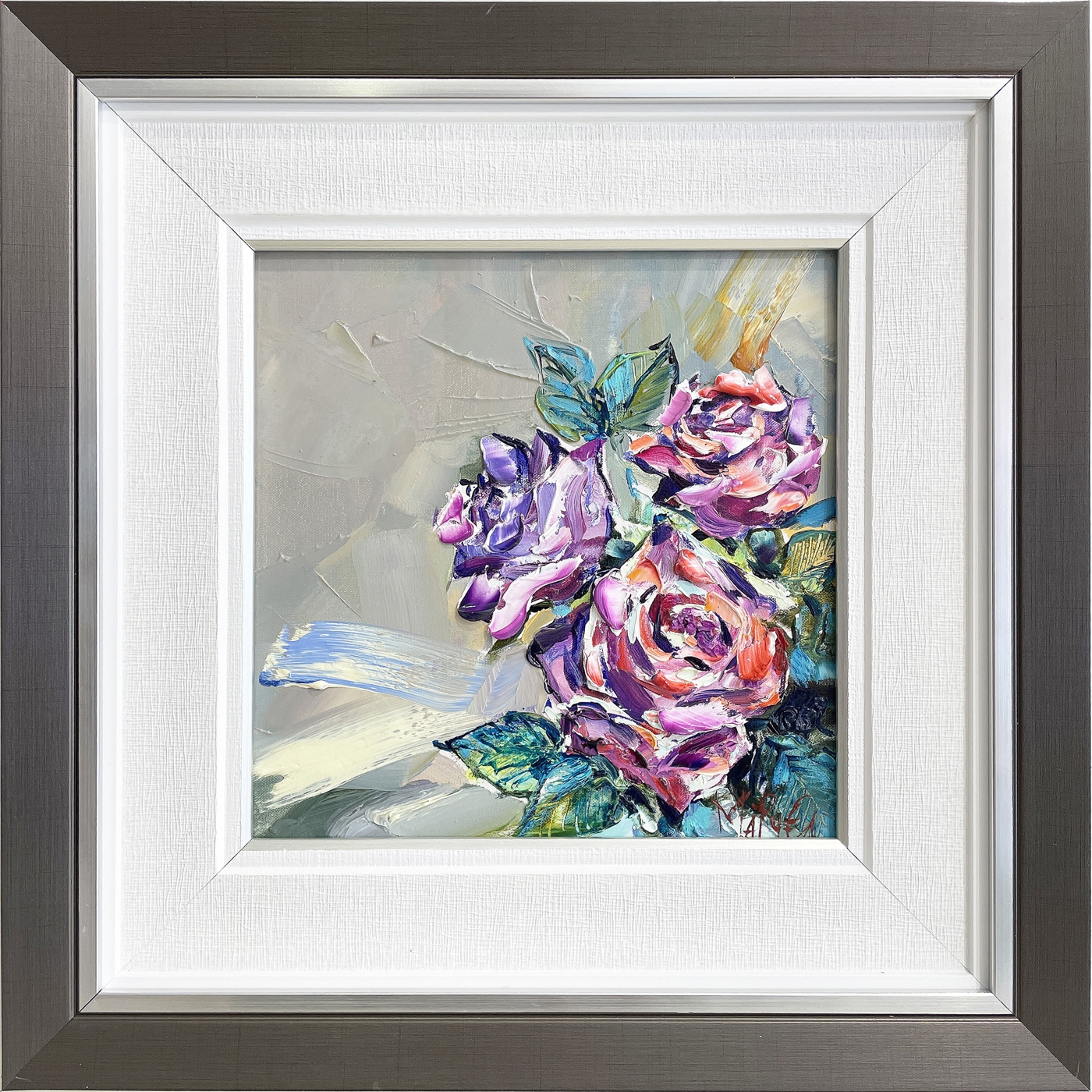 Много изискан,но скромен букет от три розови рози със своето кадифено излъчване на лилаво-синя светлина и неизмеримо дълбок ализарин в претендиращо светлата сянка в цветовете на цветята.